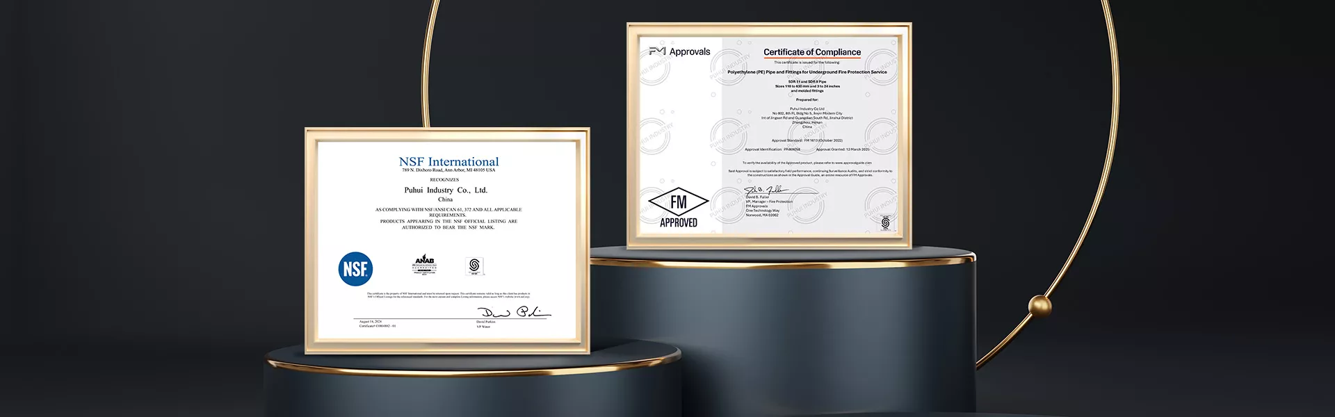 PuHui Industry is a high-tech company integrating R&D, production and distribution for 30 years, and provides HDPE pipe, Fittings, PVC pipe, PVC fittings, Welding Machine, etc. mature products and solutions used in water supply, gas, fire, electrical conduit ,drainage, dredging,mining, lrrigation and Aquaculture. Our certificates are FM, UL, SAA, NSF, WRAS, ISO, CE,etc.